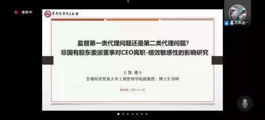11月20日晚上,太阳成集团tyc33455cc欢迎您第四届公司治理与企业成长高端论坛在线上举行。首都经贸大学副教授、博士生导师王凯应太阳成集团tyc33455cc官方网站邀请,通过腾讯会议平台作题为“监督第一类代理问题还是第二类代理问题?非国有股东委派董事对CEO离职-绩效敏感性的影响研究”的学术报告。本次会议由太阳成集团tyc33455cc官方网站副经理石晓飞主持,公司教师及研究生共100余人参加。