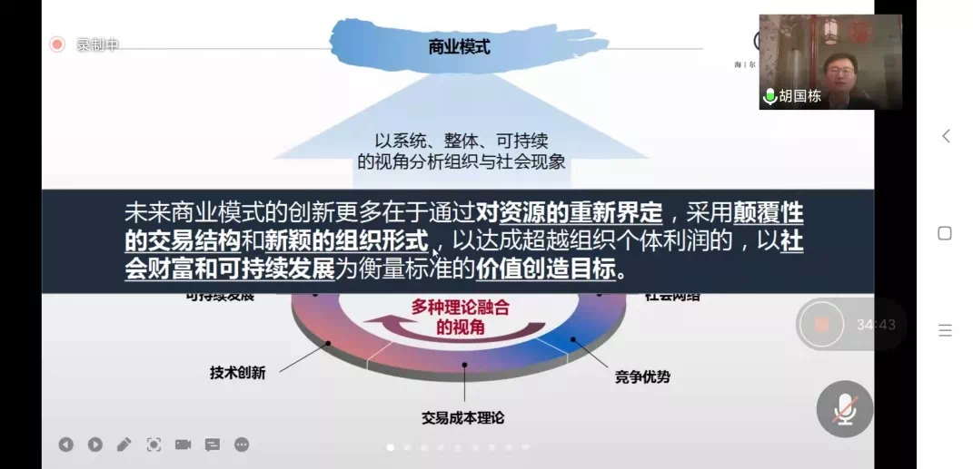 首先,胡国栋教授带领大家走进海尔,他指出海尔是一家物联网生态企业,介绍了海尔的组织模式和其当前对海尔制的学术研究。随后,他对物联网时代的管理挑战、海尔的文化基因与企业转型、人单合一:创建世界级的物联网模式、DAO:海尔组织的转型之“道”、海尔制:第三次企业管理革命五个方面进行详细讲解,指出未来商业模式的创新更多在于通过对资源的重新界定,采用颠覆性的交易结构和新颖的组织形式,达成超越组织个体利润、以社会财富和可持续发展为衡量标准的价值创造目标。对于探索与迎接新的管理时代,他指出管理没有终极的答案,只有永恒的探索,我们需要通过积极的探索实现从量变到质变的飞跃,从而引发管理的变革。