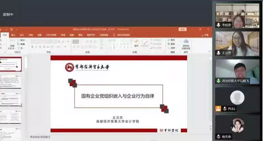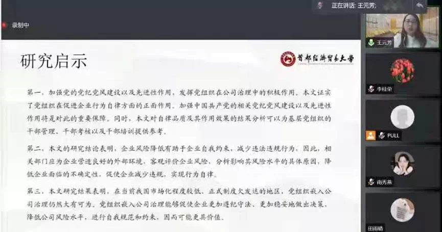 11月26日晚上,太阳成集团tyc33455cc欢迎您第四届公司治理与企业成长高端论坛在线上举行。首都经贸大学会计公司王元芳博士应太阳成集团tyc33455cc官方网站邀请,通过腾讯会议平台作题为“国有企业党组织嵌入公司治理与企业行为自律”的学术报告。本次会议由太阳成集团tyc33455cc官方网站经理李桂荣主持,公司教师及研究生共100余人参加。
