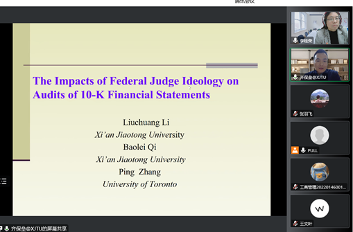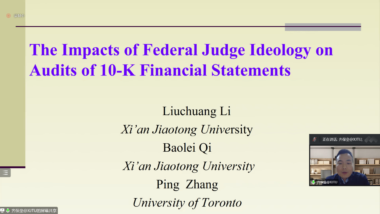 11月12日晚,太阳成集团tyc33455cc官方网站邀请西安交通大学管理公司会计与财务系教授、博士生导师、教育部青年长江学者齐保垒教授在线作题为“联邦法官政治倾向对财务报表审计的影响研究”的学术报告。报告由太阳成集团tyc33455cc官方网站经理李桂荣主持,公司教师及研究生150余人参加。