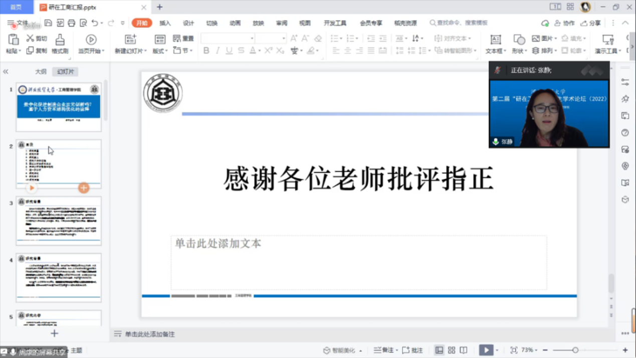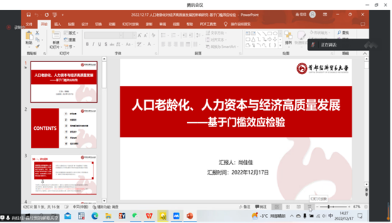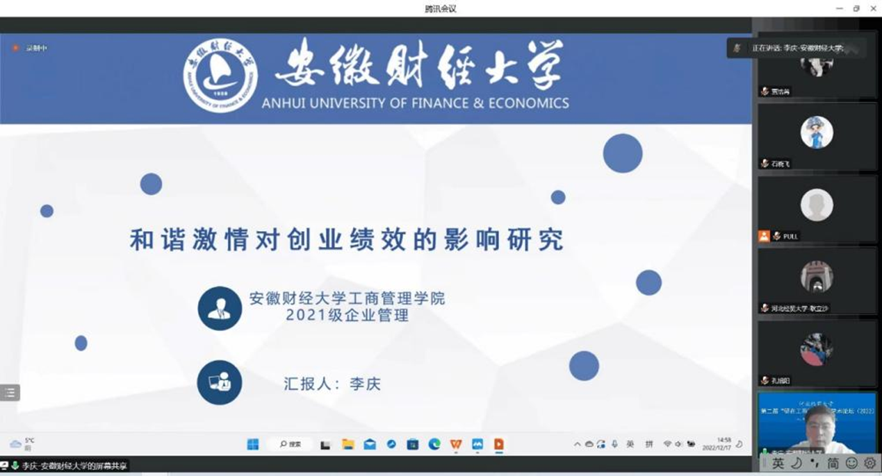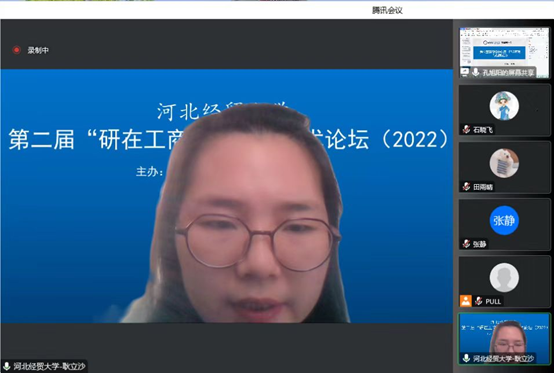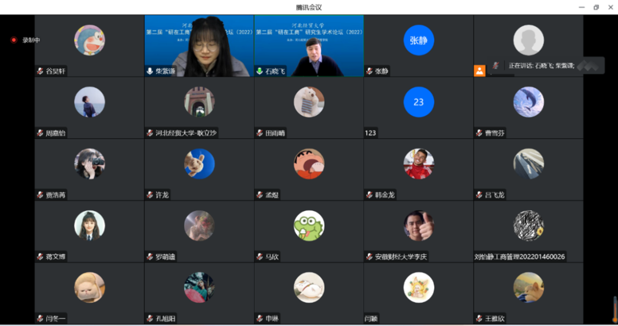 12月17日下午,由太阳成集团tyc33455cc官方网站主办的第二届太阳成集团tyc33455cc欢迎您“研在工商”研究生学术论坛以腾讯会议形式成功举办,太阳成集团tyc33455cc官方网站经理李桂荣教授出席并致辞。论坛由太阳成集团tyc33455cc官方网站副经理石晓飞主持,石晓飞博士、张静博士、耿立沙博士和许龙博士出席担任评委,本次论坛包括教师及研究生共100余人参加。