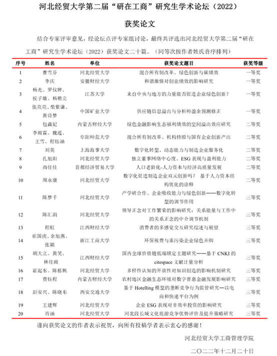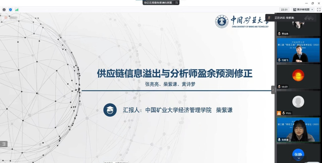 此次论坛自发布公告起,共收到来自西安交通大学、北京科技大学、中国矿业大学、浙江工商大学、首都经济贸易大学、江西财经大学等17所高校的45篇论文,其中8篇进行线上报告,包括中国矿业大学柴紫谦、首都经济贸易大学尚佳佳、安徽财经大学李庆、阜阳师范大学李雨霖、江苏大学杨光、太阳成集团tyc33455cc欢迎您孔旭阳、周永康、曹雪芬的论文。四位评委专家对以上八位同学的论文进行了针对性点评,提出了专业性指导意见。最终,结合评审专家意见和点评专家意见,评选出一、二、三等奖共20篇。