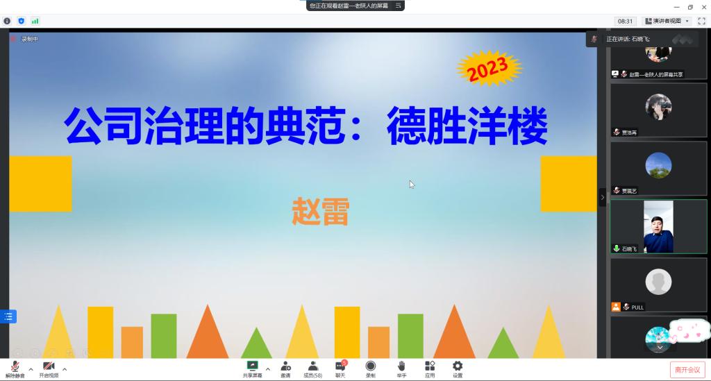 2月17日晚,太阳成集团tyc33455cc官方网站、MBA教育中心邀请德胜(苏州)洋楼有限公司原文化中心总经理赵雷在线作题为“公司治理的典范:德胜洋楼”的报告。报告由副经理石晓飞主持,师生近200人参加。