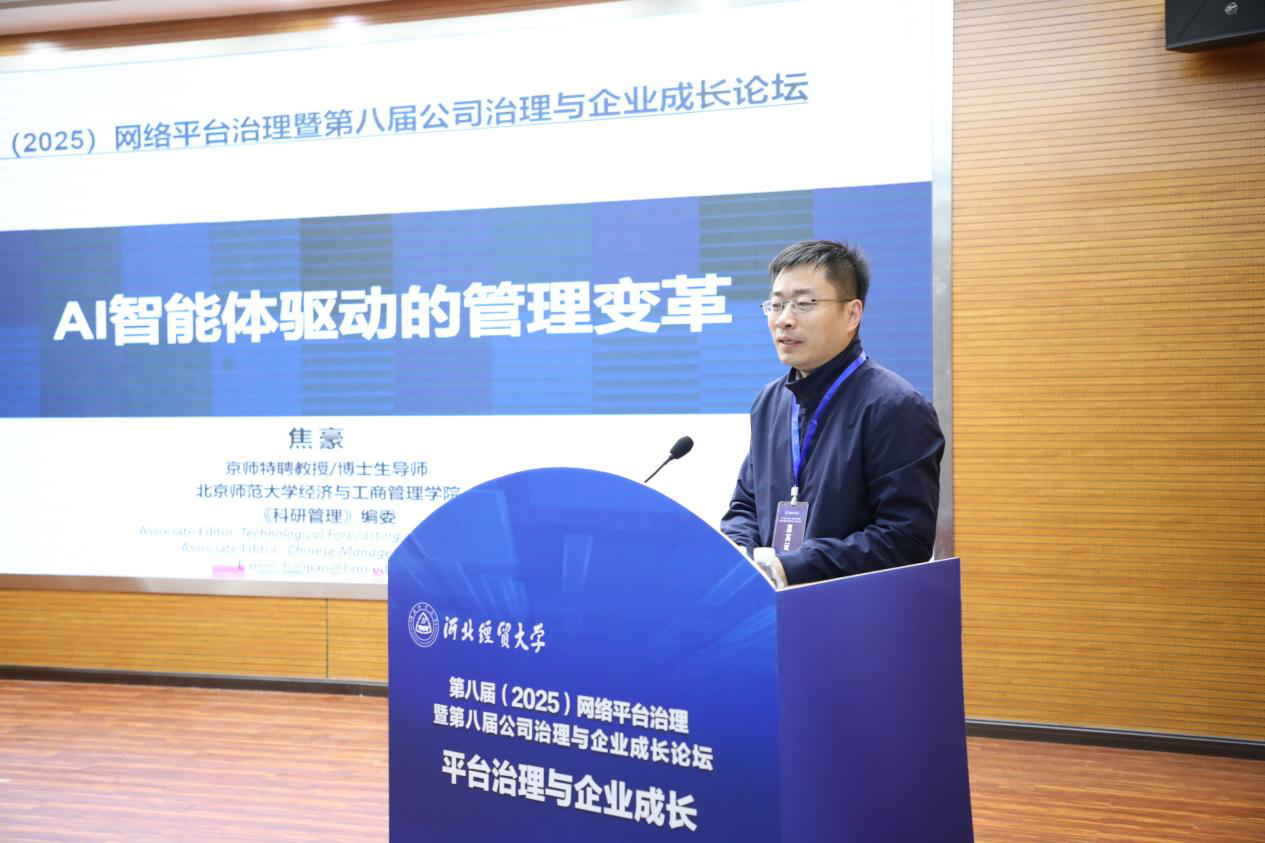 北京师范大学经济与太阳成集团tyc33455cc官方网站焦豪教授作题为“AI智能体驱动的管理变革”的主题报告。焦豪教授首先系统分析了工业经济、数字经济、人工智能三个时代的竞争优势逻辑演变,结合平台企业案例及相关学术研究成果,阐释了AI智能体对网络效应的延伸作用及其对数字平台生态的影响。随后深入分析了AI智能体对公司治理、战略管理、组织结构、营销管理以及人力资源等企业管理各领域的具体影响,并提出了AI在企业管理中的“扎根、限定、重塑”三大应用路径。关于未来研究方向,焦豪教授提出了多元化的本土化拓展建议,包括探索“管理者-AI-员工”三方关系的新型管理逻辑、研究AI对数字初创企业商业模式的影响、分析组织与AI双向互动机制,以及解决人机协同决策中的责任界定等关键问题。